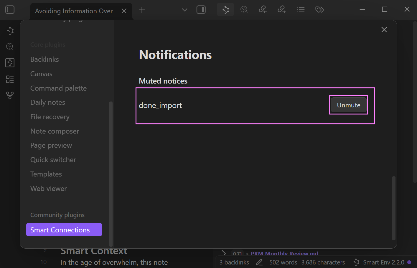Smart Env uses notifications to show what it is doing, especially during embedding-heavy operations like re-importing.