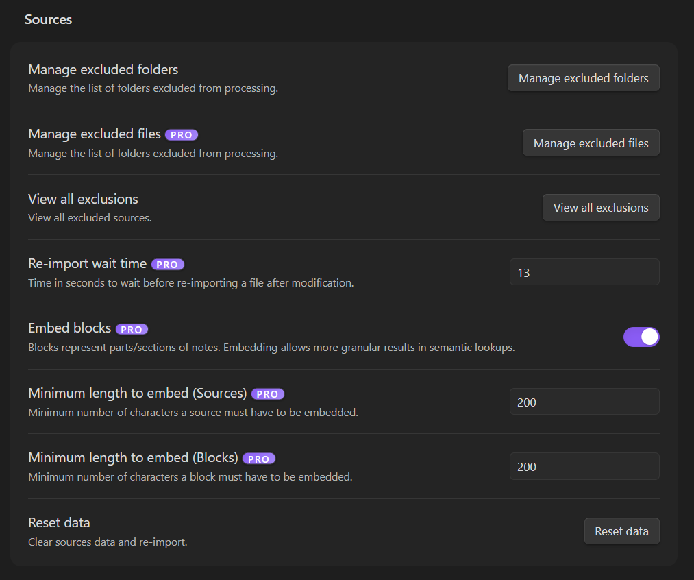 Sources settings control what gets processed (and what is ignored), plus the actions that rebuild source and embedding data.