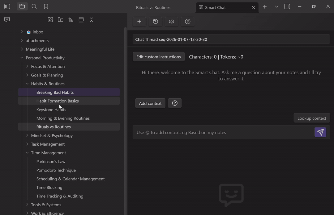 - Lookup context: retrieve relevant notes automatically