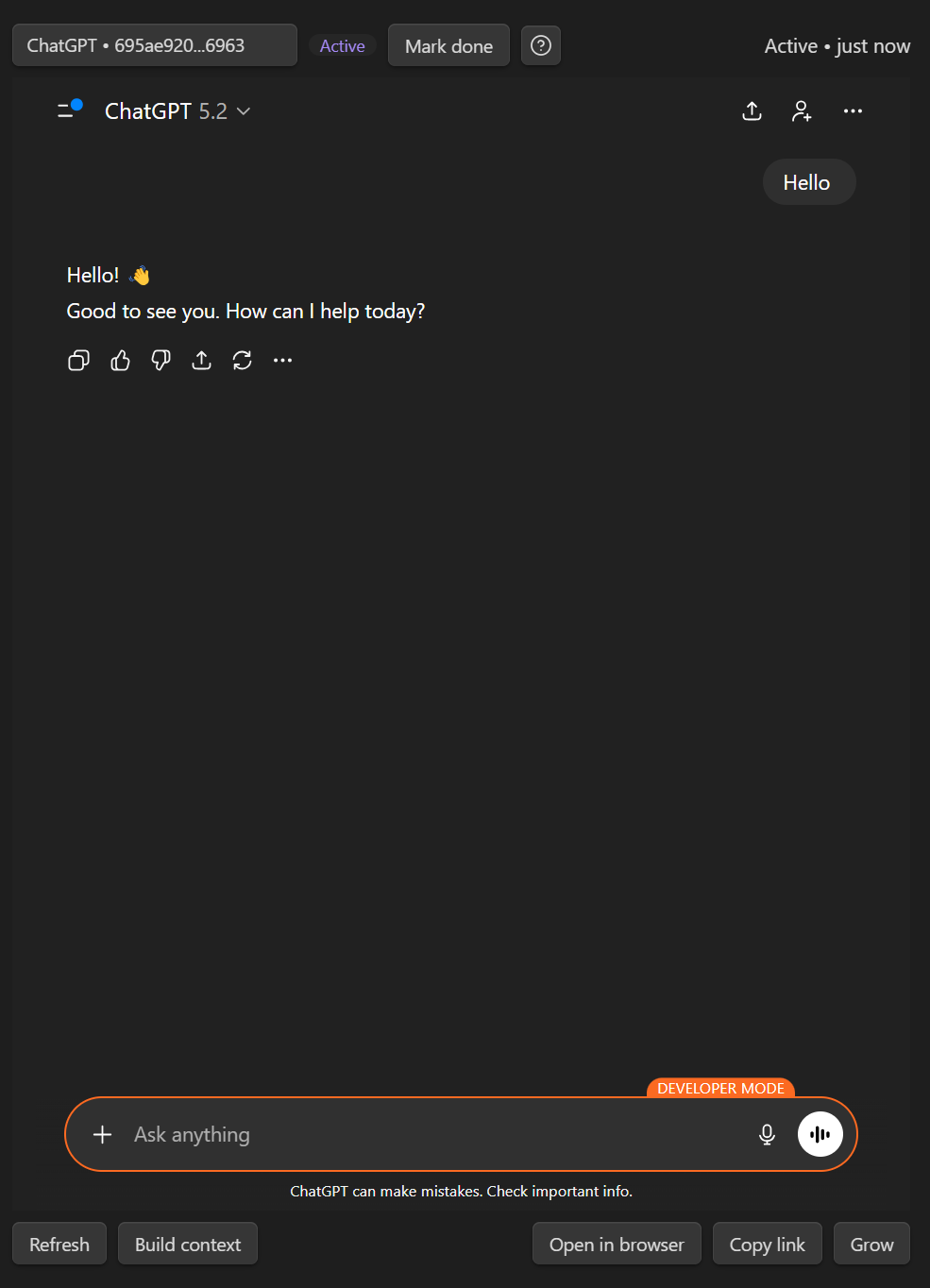 - Optional (high leverage): click Build context to curate vault context for this thread before you send the next prompt.