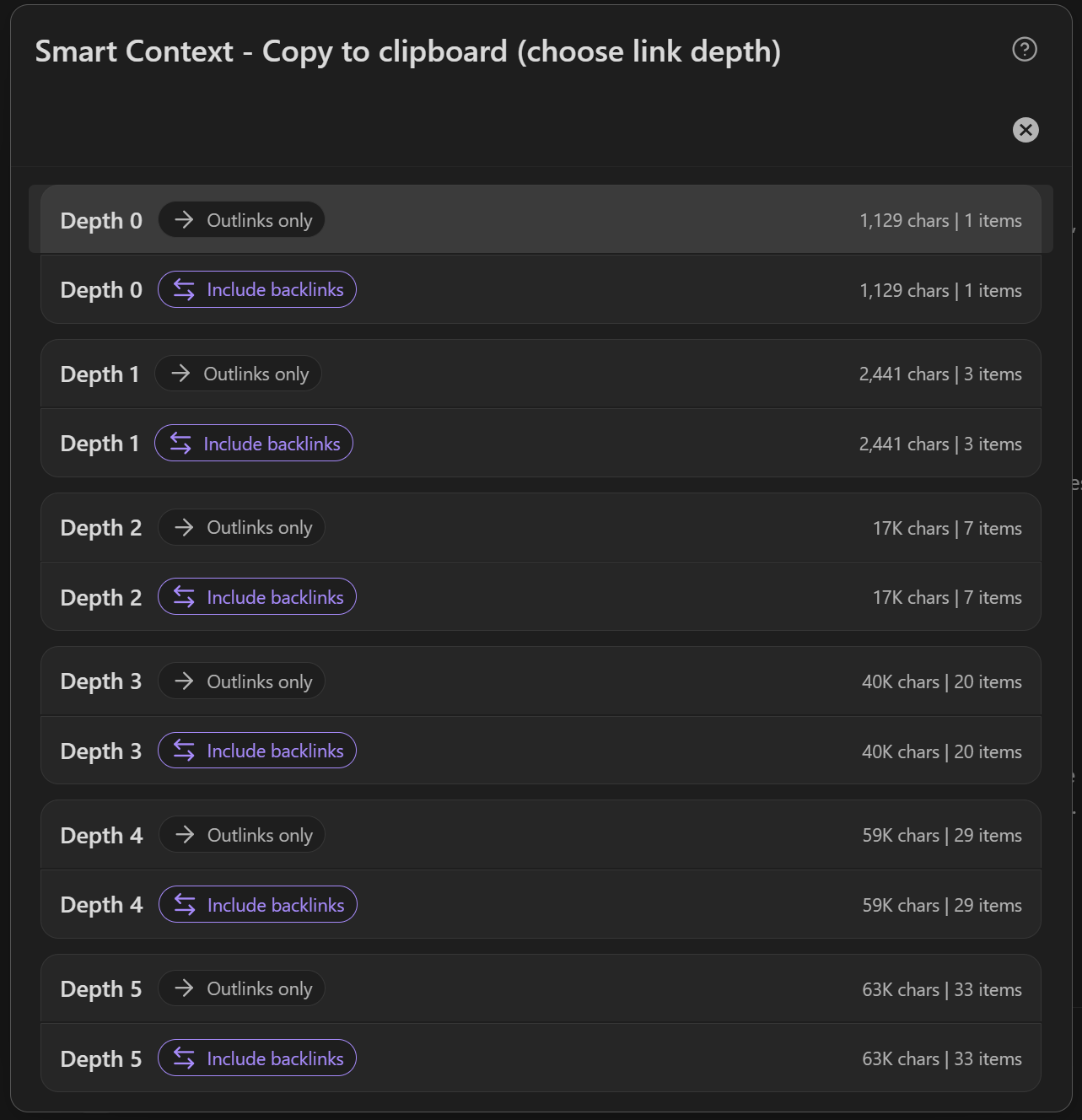 The chooser shows a size estimate for each depth option so you can choose based on your token budget before copying.