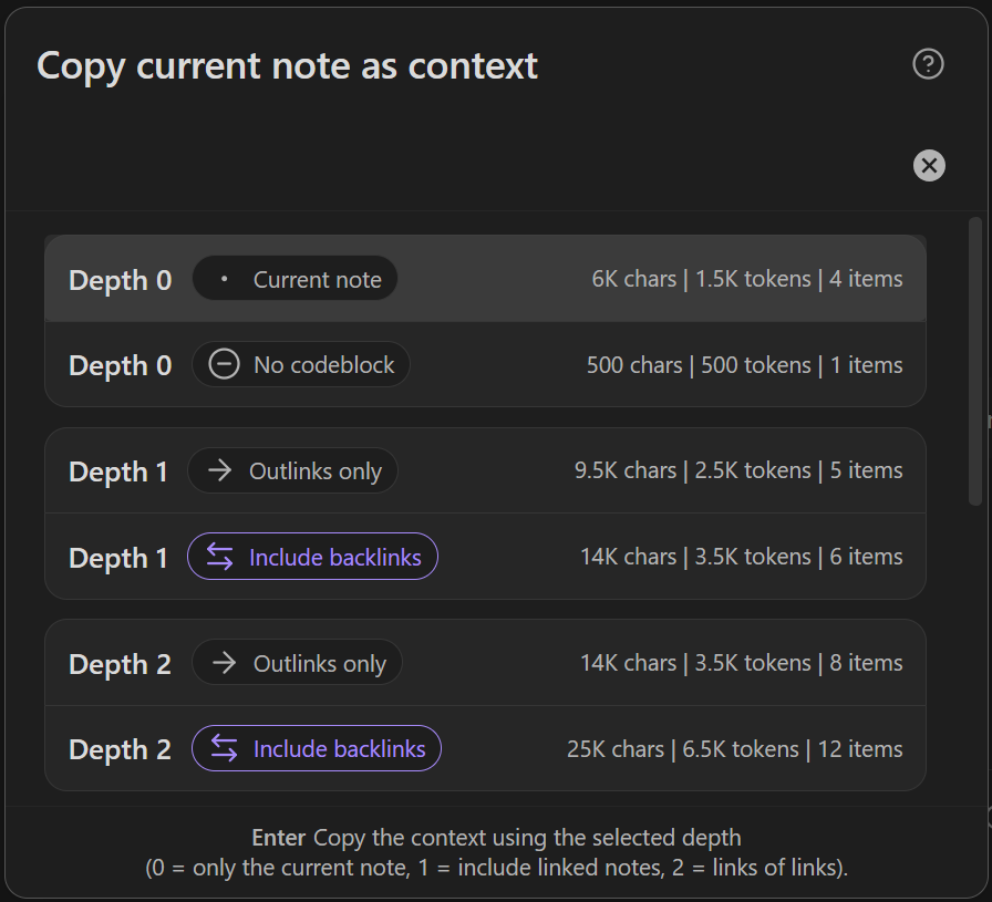 Depth 0copies only the active note, plus hydrated codeblock items unless you chooseNo codeblockDepth 1includes directly linked notesDepth 2includes links of links- deeper rows continue the same pattern where available