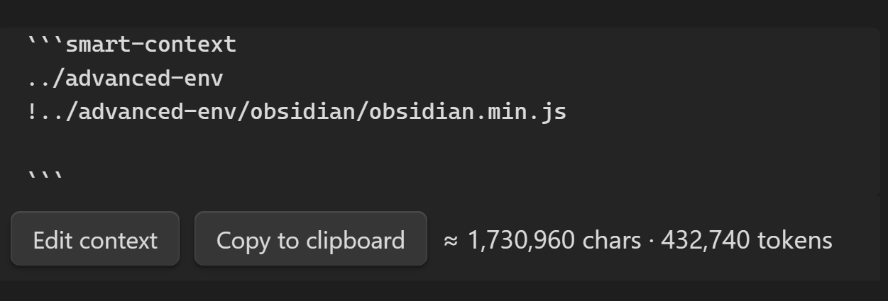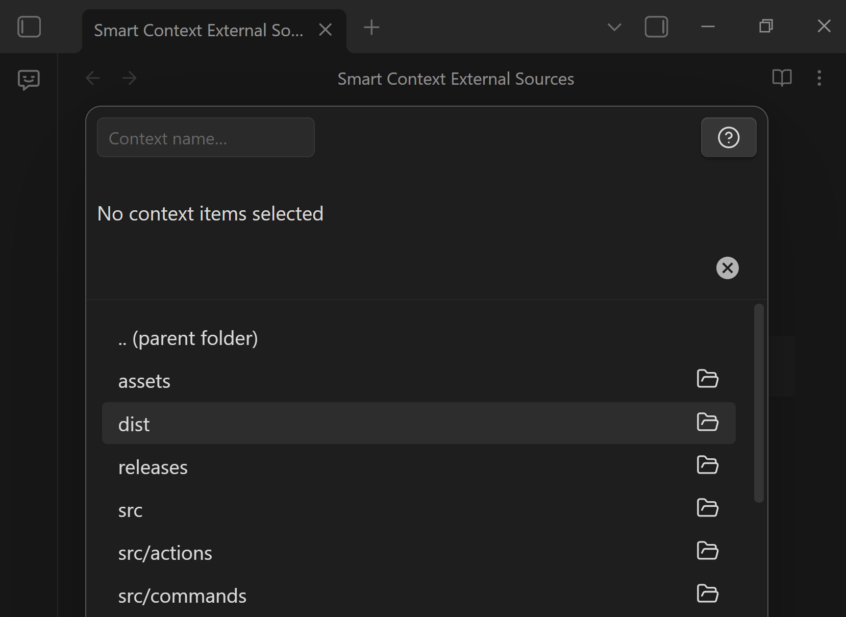 This opens the external selector modal and inserts (or updates) the smart-context codeblock in the active note.