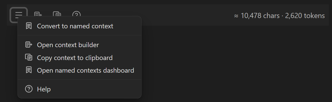 The builder uses the current plugin's available context_suggest_* actions, so Pro automatically adds external suggestions while Core stays note and named-context focused.