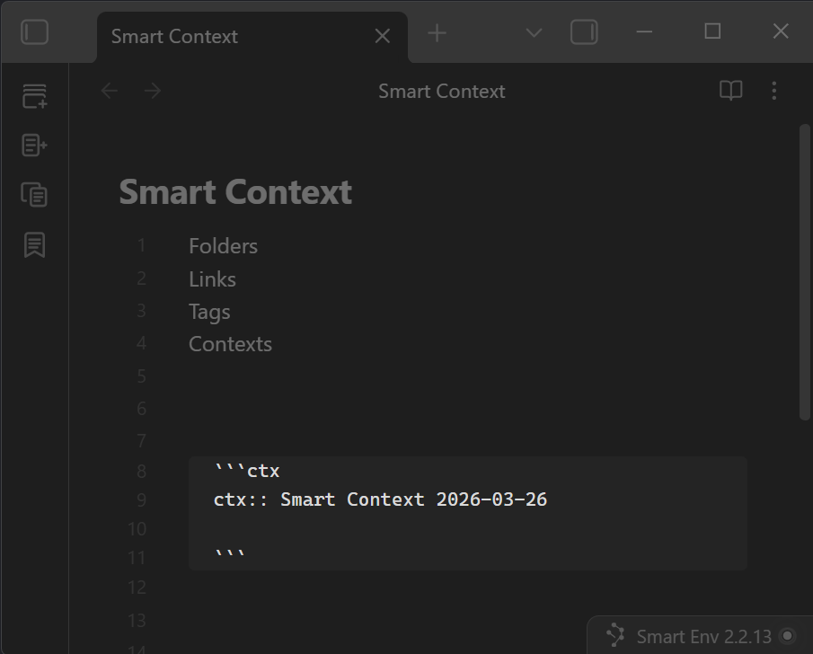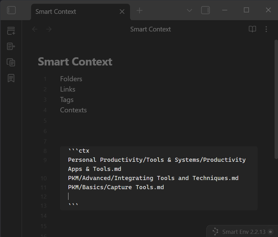 The Smart Context Codeblock keeps a visible context manifest inside the note that needs it.