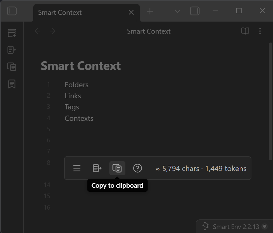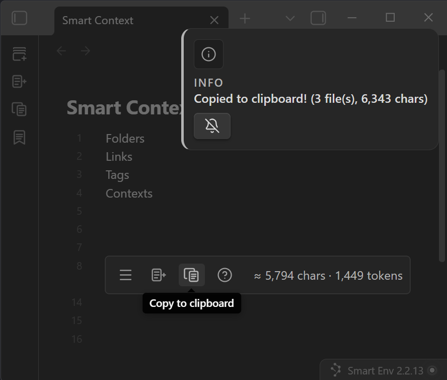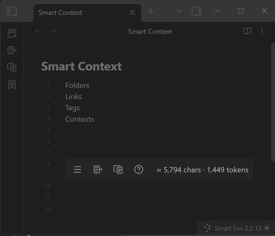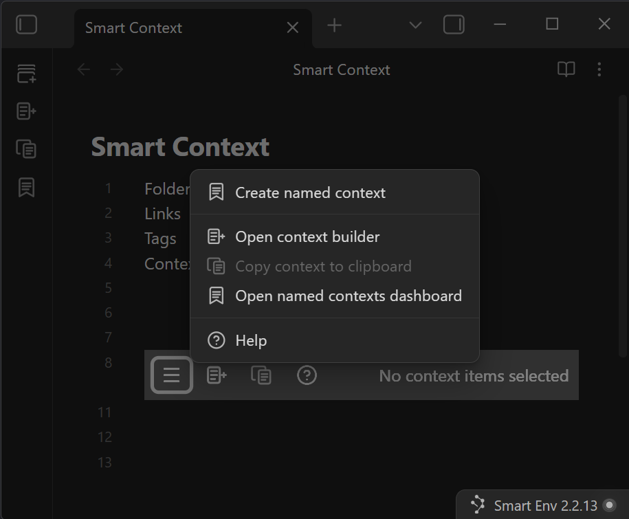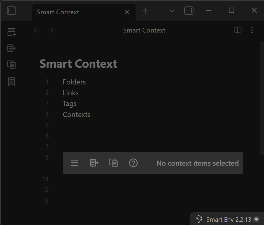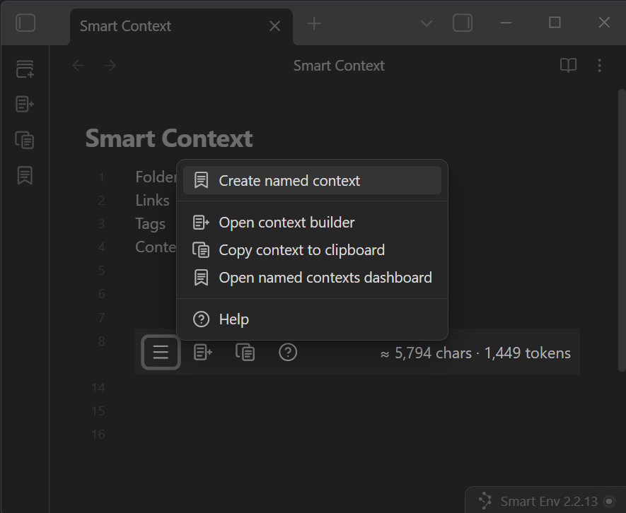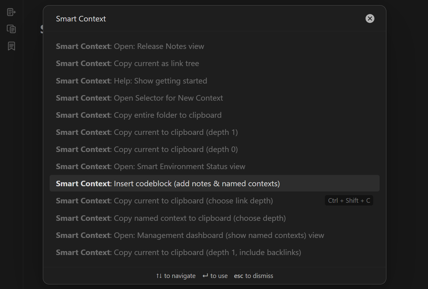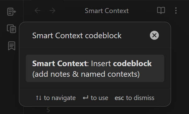 An empty codeblock renders a compact Smart Context UI directly in the note.