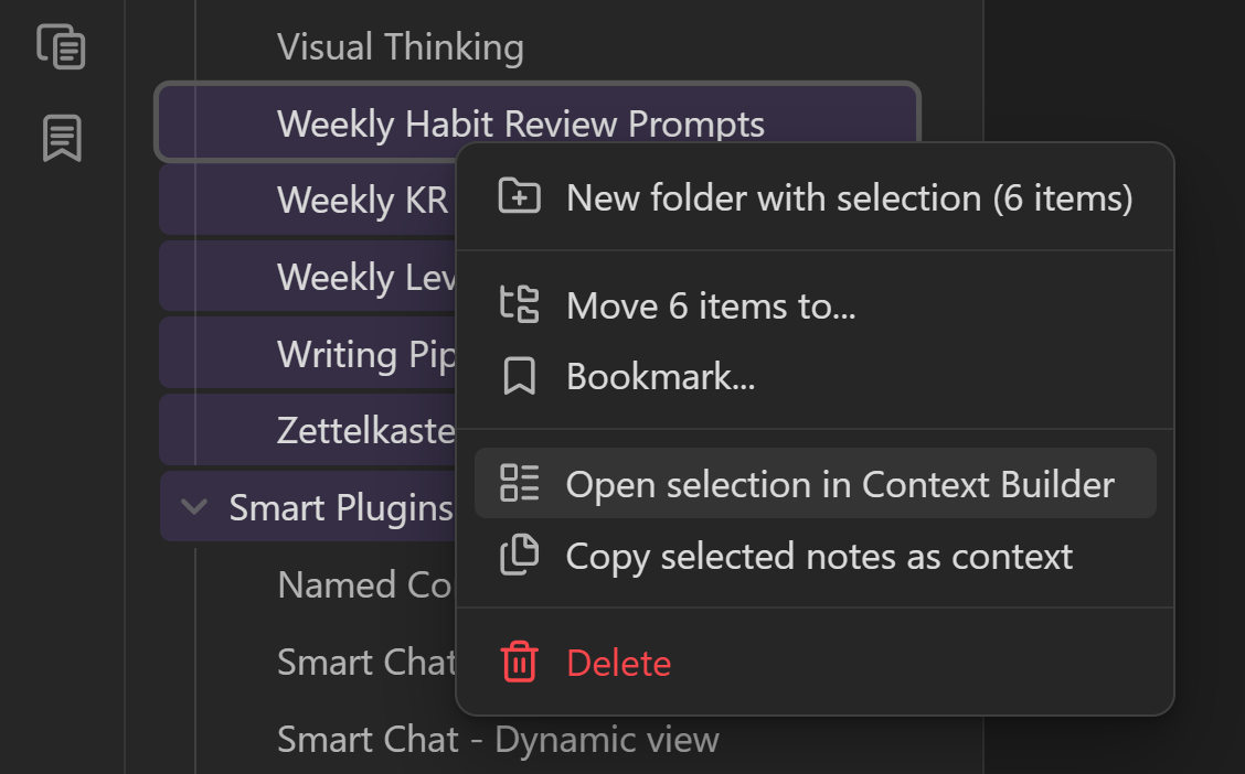 - Multi-select files -> Copy selected notes as context.