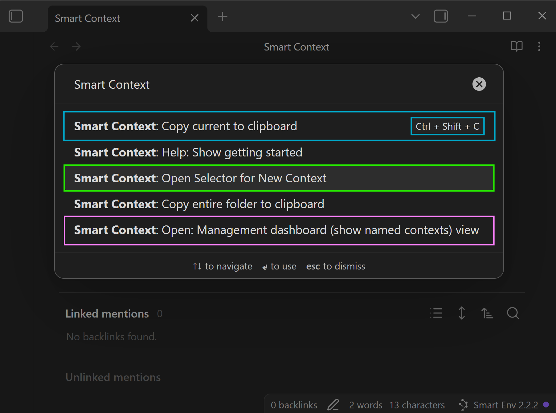 - Install Smart Context: https://obsidian.md/plugins?id=smart-context