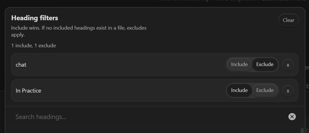 - Use fuzzy search to add headings, then toggle Include or Exclude per heading.