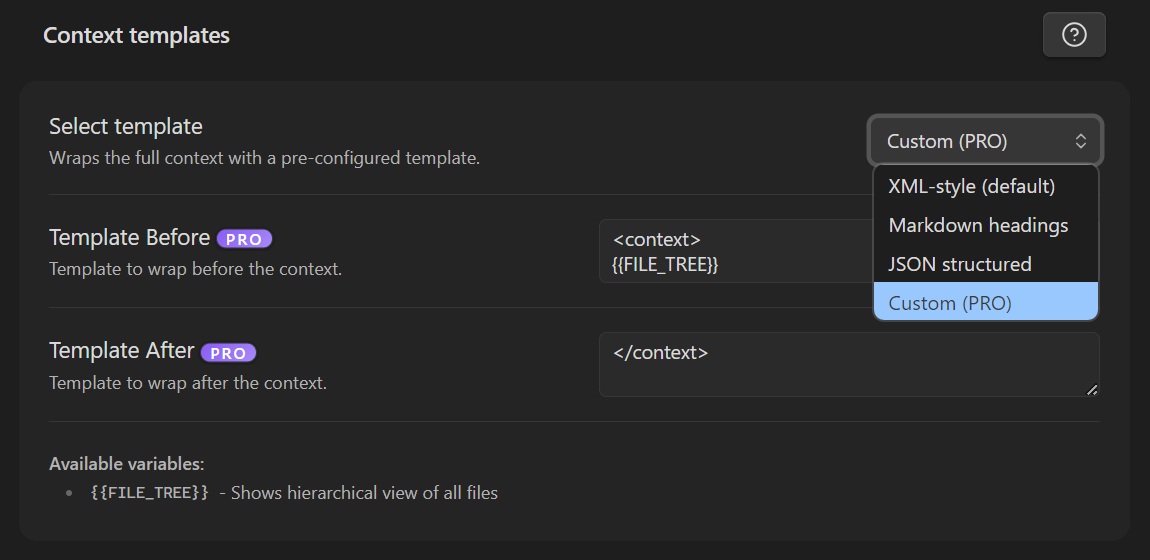 - Context templates wrap the entire export.