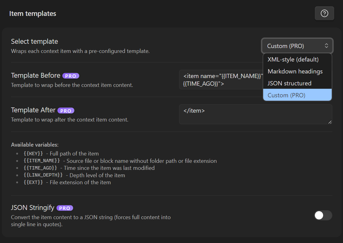 {{KEY}}- full path of the item.{{ITEM_NAME}}- source file or block name without folder path or file extension.{{TIME_AGO}}- time since the item was last modified.{{LINK_DEPTH}}- depth level of the item.{{EXT}}- file extension of the item.