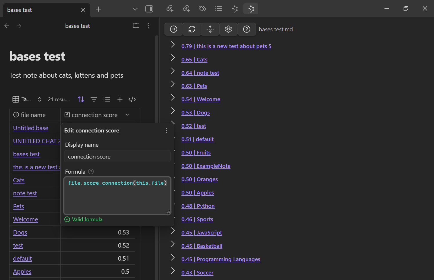 score_connection(file, compared_to)orfile.score_connection(compared_to)— Returns a numeric similarity score between two notes (global and instance variants). Pair it with a numeric column to compare an active row against a reference note.list_connections(file)orfile.list_connections()— Outputs the top five connections as wiki links so you can click straight into the related notes from the table.