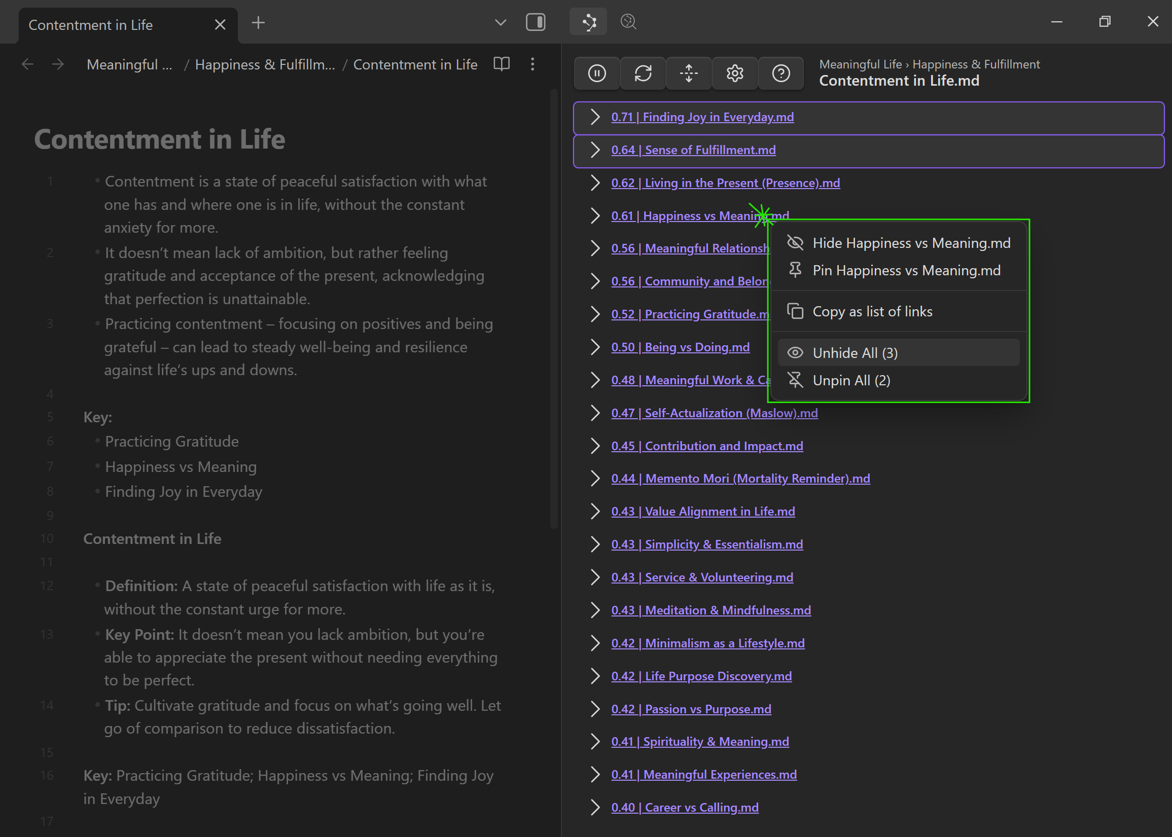 Pinned and hidden states are saved on the source item, so the plugin remembers your choices across sessions. Feedback-aware scoring actions such as sim_feedback_weighted use these states to boost notes similar to pinned items and dampen those that resemble hidden ones.