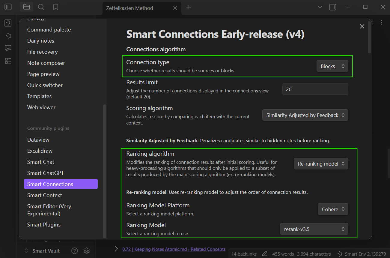 results_collection_key(dropdown, defaultsmart_sources) — Choose whether candidates originate from Smart Sources or the Smart Blocks index.score_algo_key(dropdown) — Populated dynamically viaget_score_algo_key_options. Each algorithm maps embeddings and feedback metadata into a ranked list.connections_post_process(dropdown, defaultnone) — Optional post-processing stage (for example, Cohere via Smart Rank) to re-rank candidates after scoring.