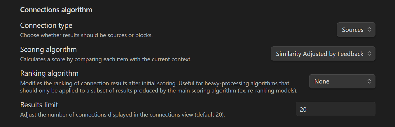 Tune result sources, scoring strategies, and post-processing models directly from the settings tab. New scoring algorithms improve results based on which connections were hidden or pinned. The ranking algorithm can be configured to use the Cohere Re-ranking model.