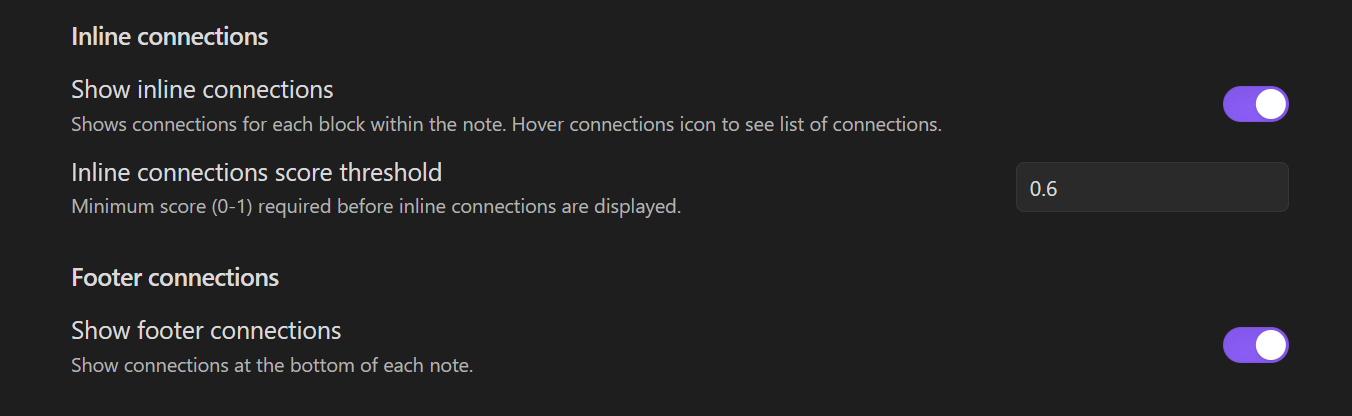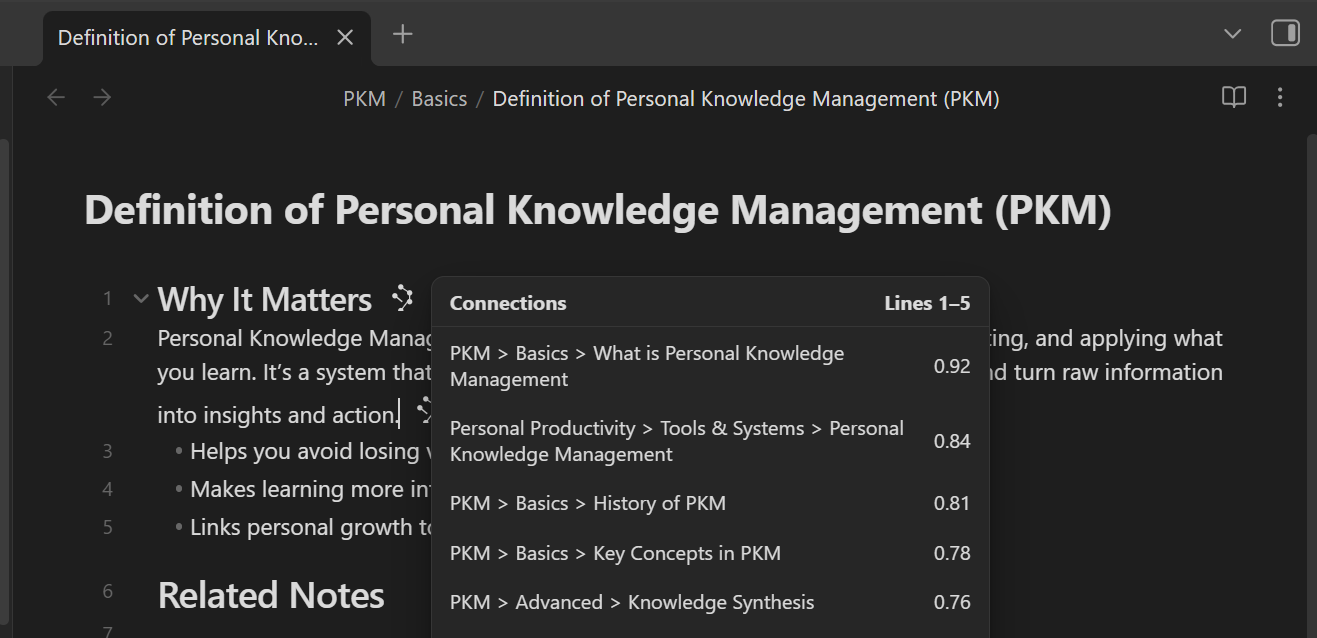 Hover the inline connections icon beside a block to preview related notes without leaving the editor. Inline decorators respect your configured score threshold so you only see high-confidence matches. Click a result to open the note. Click the top "Connections" line to see all connections for the current block in the main Connections view.