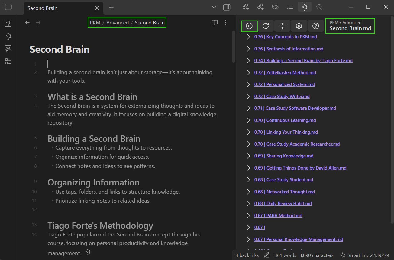 - Similarity Weighted by Feedback – boosts candidates that resemble pinned notes and dampens those similar to hidden results. Use this when you actively curate results inside the Connections surfaces.