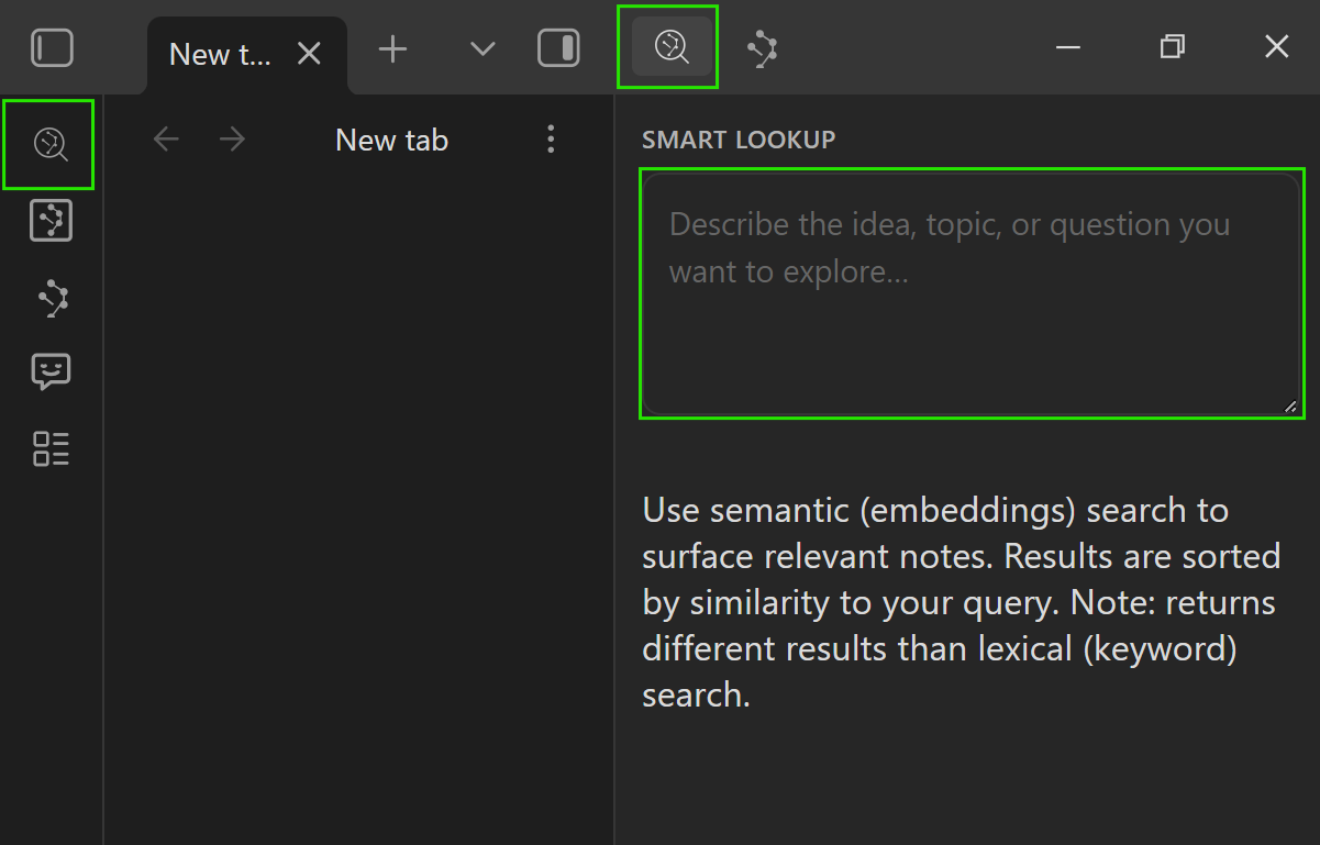 Open the Smart Lookup (Early-release) view from the sidebar icon or command palette to run ad-hoc semantic searches across your vault.
