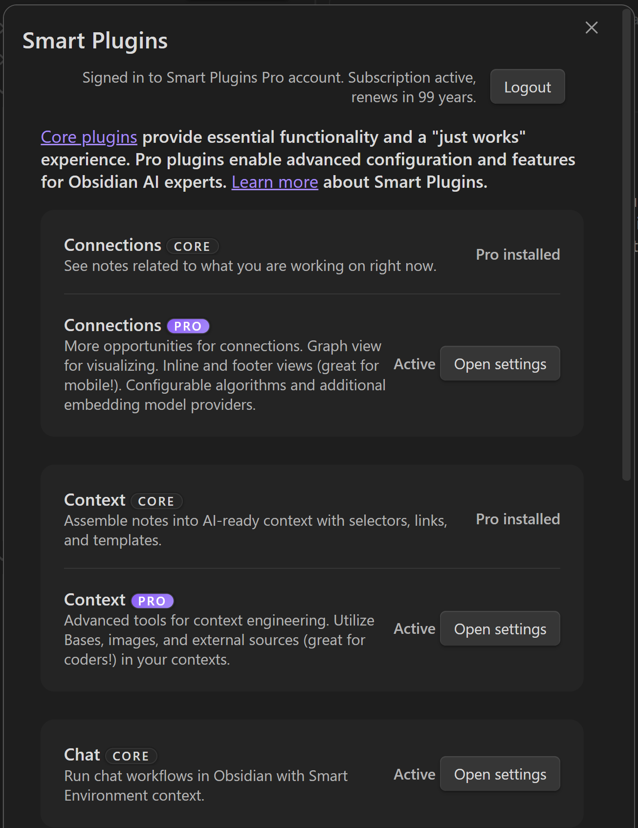 You can open the Smart Plugins view from settings, the status bar, or the command palette. This keeps Smart Environment settings focused on configuration while giving Smart Plugins their own clearer home.