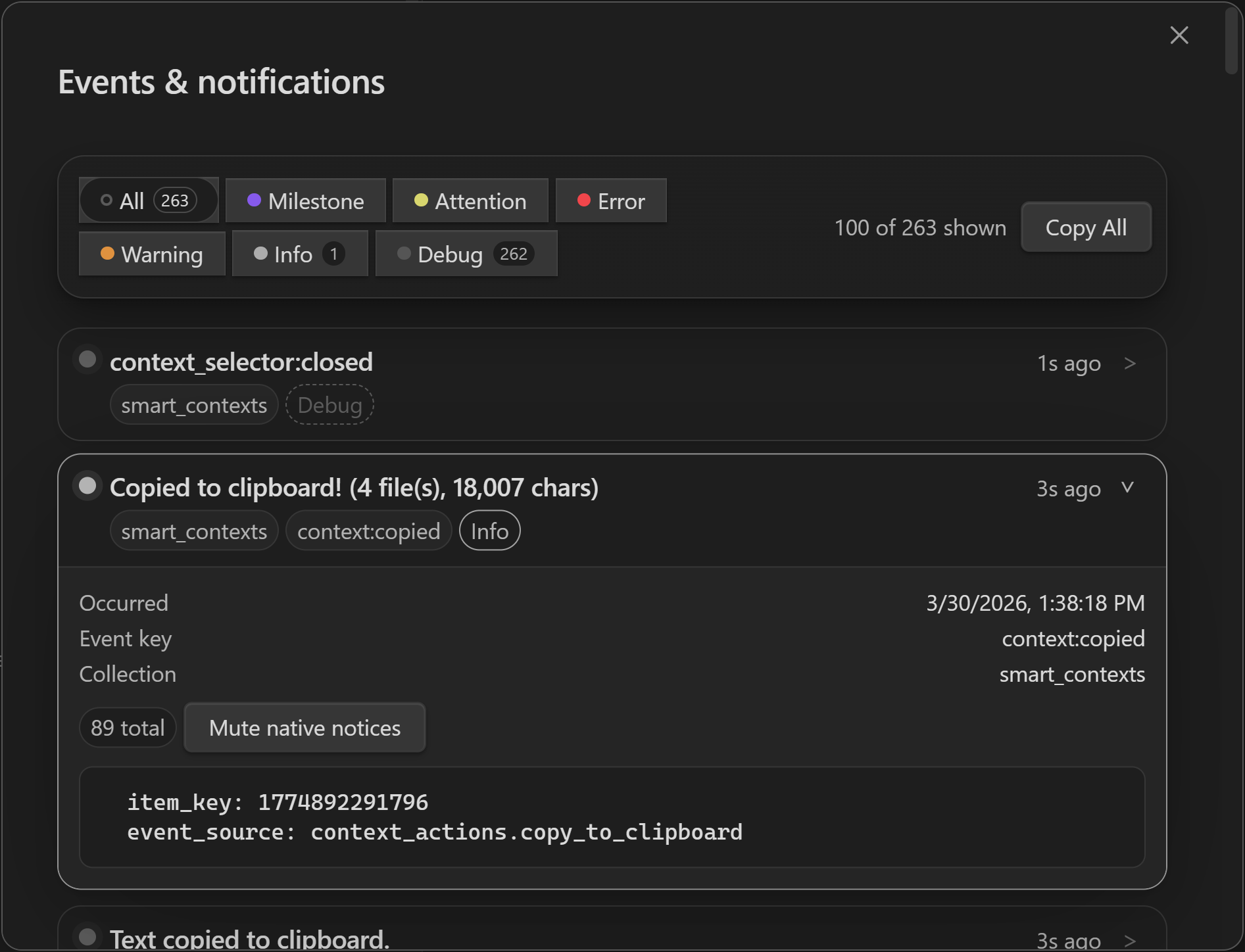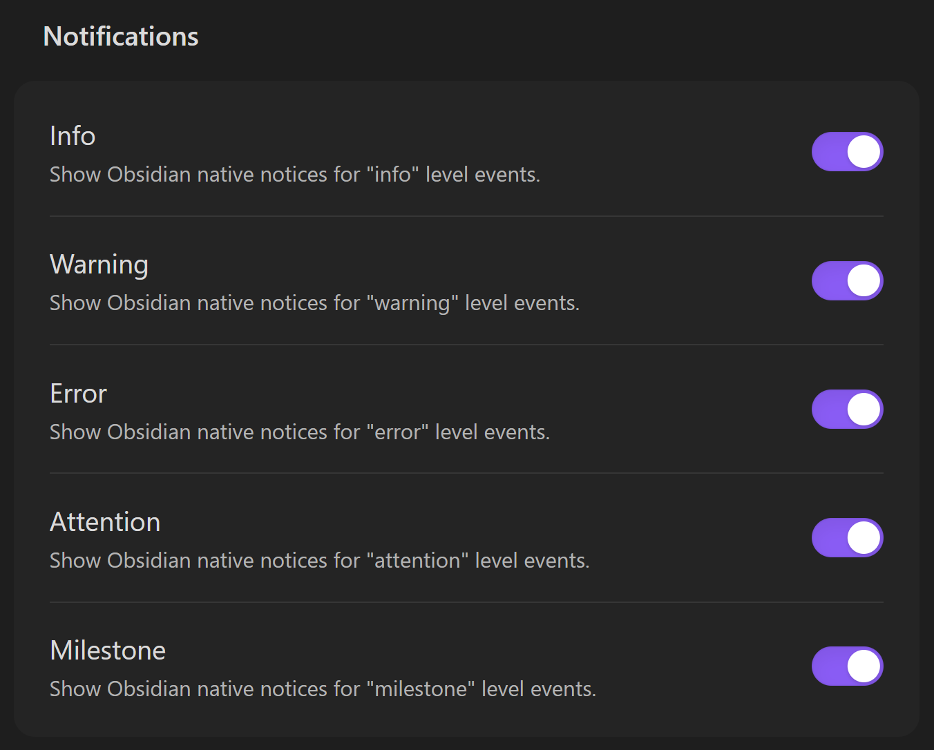Notifications can now be controlled by event level, including Info, Warning, Error, Attention, and Milestone. If you mute a level, native Obsidian notices for that level stop appearing, but the events are still available in the feed and can still surface briefly in the status bar when that makes sense.