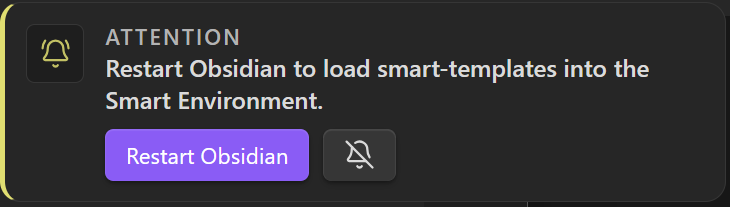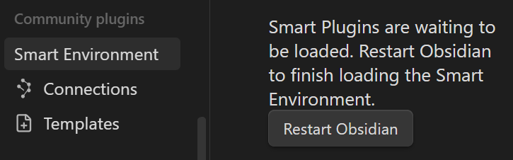 Enabled Smart Plugins register with the Smart Environment on Obsidian startup. After that, Smart Environment loads once for the session. If you enable or update a Smart Plugin after the environment is already running, Obsidian will now ask you to restart so the plugin can be wired into the shared environment cleanly.